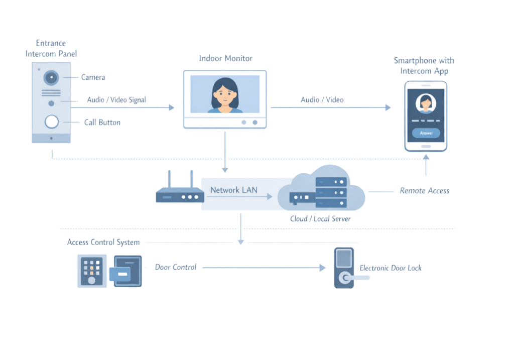 Intercom systems provide structured visitor communication and controlled entry across residential and commercial buildings. In practice, these systems combine entrance communication, identity verification, and door control within a single platform, and are deployed using IP-based, two-wire, or hybrid architectures depending on building infrastructure and operational requirements.